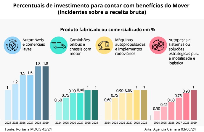 Para ter acesso aos incentivos do Mover, as empresas devem ter projetos aprovados pelo ministério e aplicar percentuais mínimos da receita bruta com bens e serviços automotivos na pesquisa e no desenvolvimento de soluções alinhadas à descarbonização e à incorporação de tecnologias assistivas nos veículos.