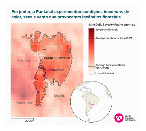 As mudanças climáticas tornaram as condições quentes, secas e ventosas 40% mais intensas e quatro a cinco vezes mais prováveis, o que impulsionou os incêndios catastróficos no Pantanal ocidental do Brasil, durante o mês de junho deste ano. A análise é do primeiro estudo de atribuição sobre o caso realizado pela World Weather Attribution (WWA), uma rede internacional de cientistas de clima com foco na produção de estudos de atribuição pouco tempo após sua ocorrência.
