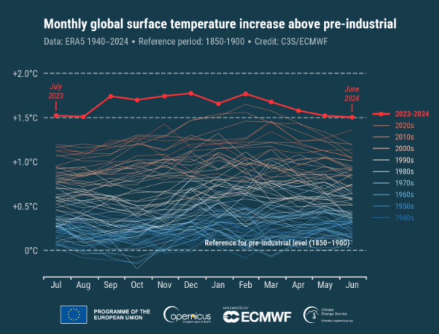 De acordo com os dados do Centro Europeu para Previsões Meteorológicas de Médio Alcance (ERA5), a temperatura em junho ficou 1,50 °C acima da média estimada para o mesmo mês no período de 1850-1900, referência pré-industrial. Tornou-se, assim, o 12º mês consecutivo a atingir ou quebrar o limite de 1,5 °C – estabelecido pelos países signatários do Acordo de Paris como seguro para a vida no planeta.