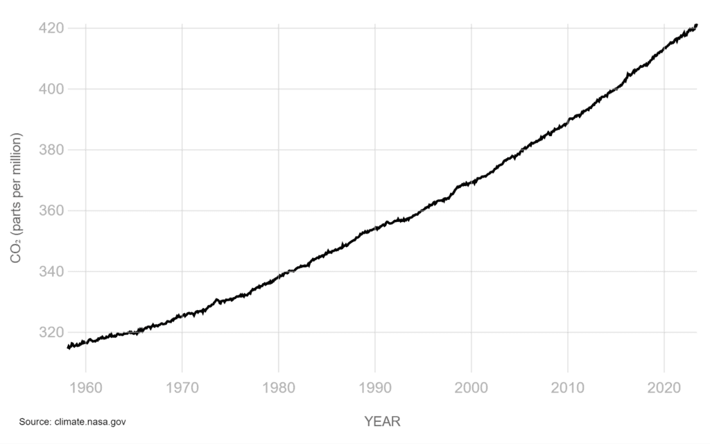 O primeiro gráfico, da esquerda, mostra os níveis atmosféricos de CO 2 medidos no Observatório Mauna Loa, Havaí, nos últimos anos, com as variações sazonais naturais removidas.
