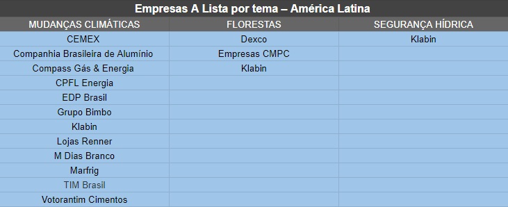 A América Latina passou a ser representada por 14 empresas, 11 delas brasileiras, sendo que sete estão pela primeira vez no grupo: Compass, CPFL Energia, Lojas Renner, M Dias Branco, TIM Brasil, Marfrig e Votorantim Cimentos. Seguem no rol do CDP a Klabin, a Companhia Brasileira de Alumínio, a EDP Brasil e a Dexco. Na relação latino-americana estão Cemex, Grupo Bimbo e CMPC.