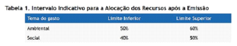 A composição indicativa é que no mínimo 75% sejam dedicados ao financiamento de novas despesas e no máximo 25% sejam dedicados ao refinanciamento de despesas já executadas, ou em curso. Visando dar transparência às categorias de alocação consideradas, o Brasil apresentou, no relatório de pré-emissão, uma listagem indicativa de categorias que podem ser consideradas para despesas verdes e sociais.